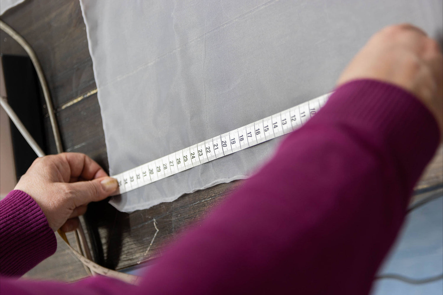 Natürlich kommen in der Schneiderei Nähmaschinen zum Einsatz, nicht selten greifen wir aber auch noch ganz klassisch zu Nadel und Faden, um unseren textilen Produkten die letzte persönliche Note zu verleihen.