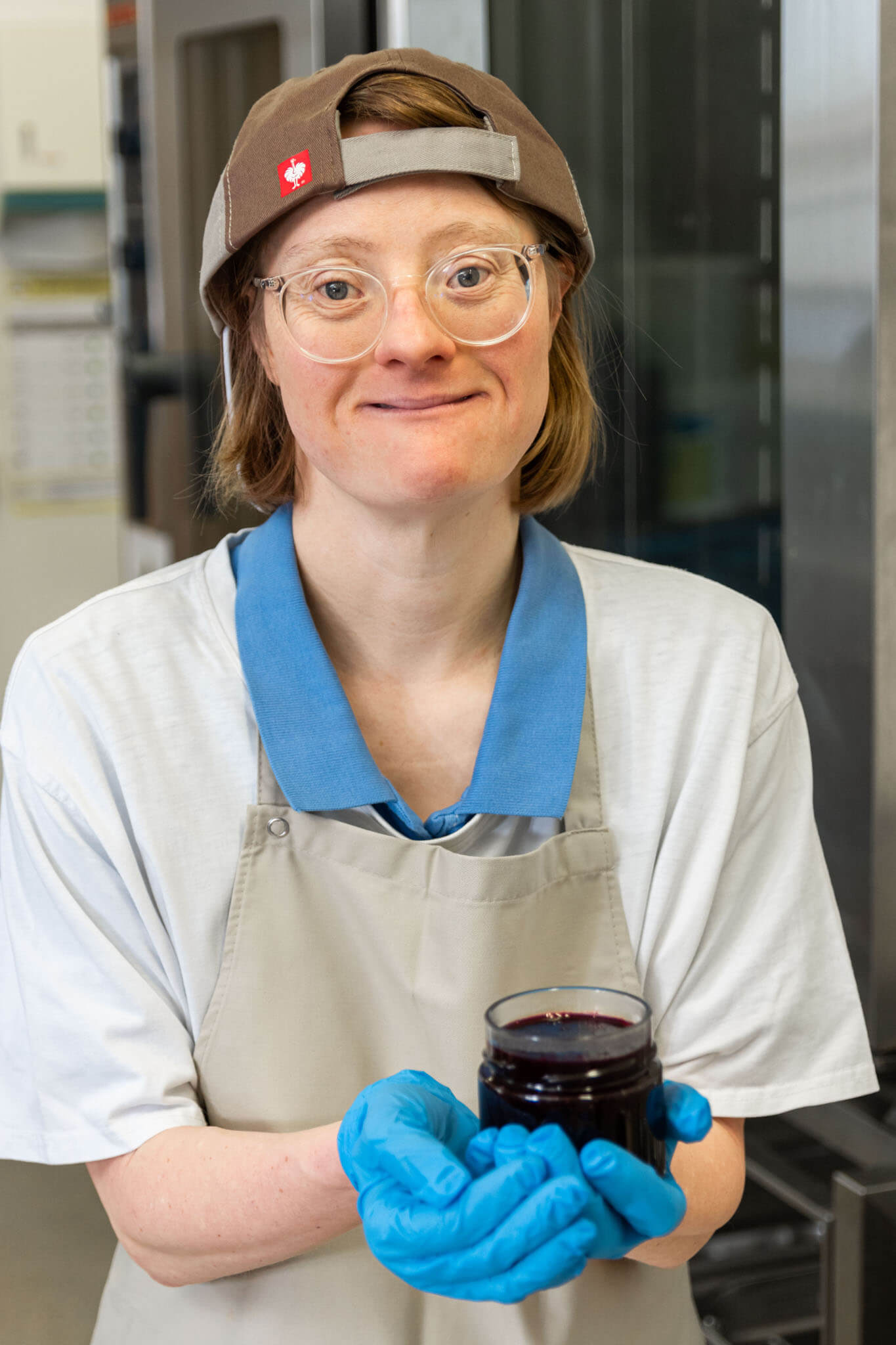 Obst und Gemüse schneiden, abgefüllte Gläser zudrehen, Lagerarbeiten: All das gehört zu den Aufgaben, die Erik in unserer Feinveredlung erledigt. Da er nur eine voll funktionierende Hand hat, braucht er für manche Arbeiten etwas länger, doch das gleicht er locker dadurch aus, dass er sich Arbeitsabläufe gut merken kann. Seinen Weg in die Feinveredlung hat der Fußball- und Formel-1-Fan über ein Praktikum gefunden. Der Jungspund im Team hat in den letzten Jahren jede Menge über Lebensmittel und deren Verarbeitung gelernt und fühlt sich bei seinen Kolleginnen und Kollegen pudelwohl. Erik steht auf Schnitzel mit Pommes in Pfefferrahmsoße. Wenn er aber nur ein Produkt aus dem Sortiment unserer Feinveredlung essen dürfte, wäre es der Pflaumenaufstrich, denn der schmeckt ihm einfach am besten.