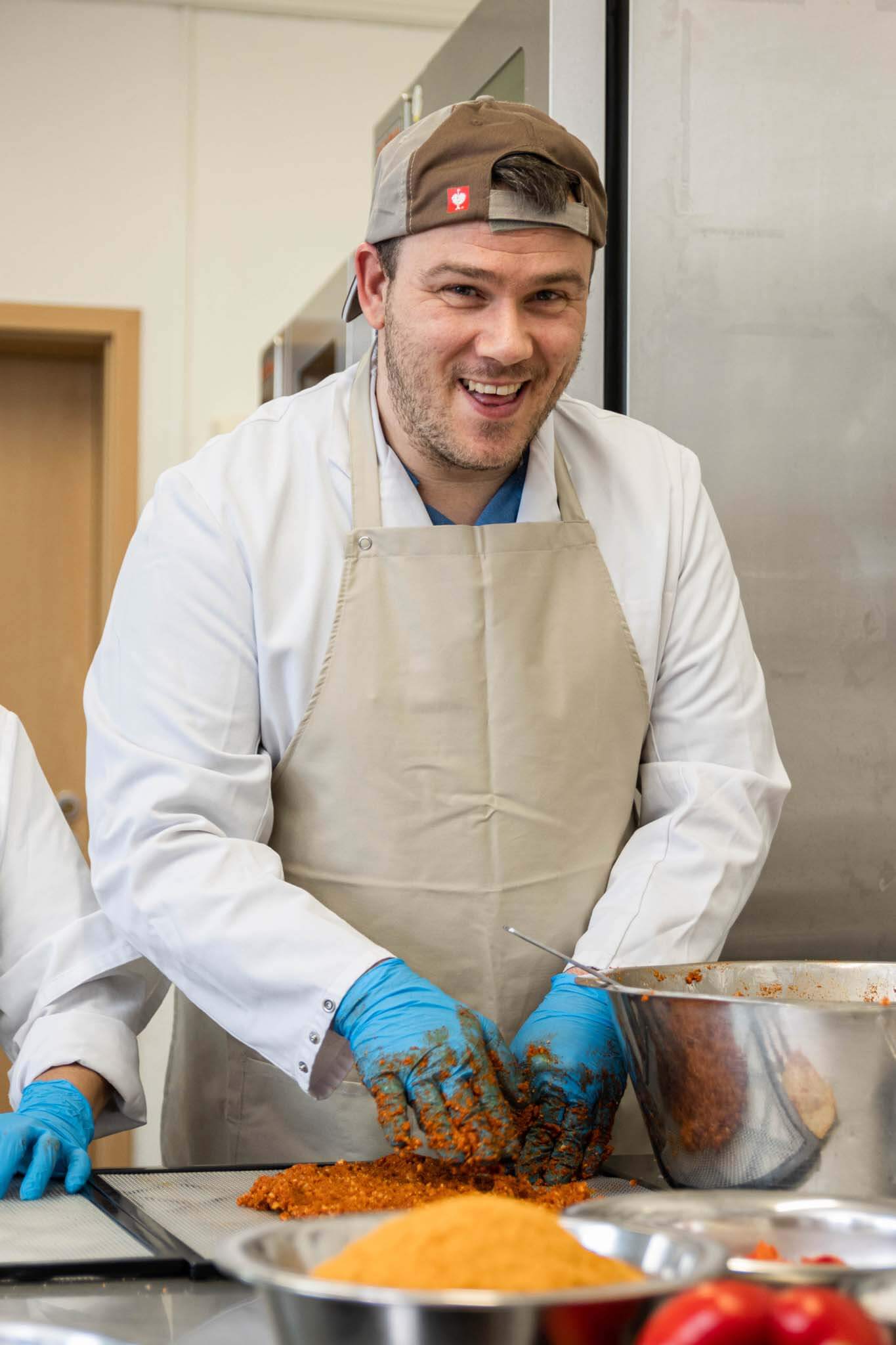 Manuel ist der Küchenprofi in unserer Feinveredlung. Siebzehn Jahre lang hat er in der antonius Küche sein Handwerk erlernt, ehe er dann 2017 zu Chutneys und Fruchtaufstrichen gewechselt ist, weil er gern etwas Neues ausprobieren wollte. Dank seiner Erfahrung hat er für seine Kolleginnen und Kollegen noch immer den einen oder anderen hilfreichen Tipp in petto. Die wissen auch seine große Zuverlässigkeit besonders zu schätzen. Zu Beginn hatte Manuel in der Feinveredlung noch mit zwei besonders fiesen Gegnern zu kämpfen: Lauch und Zwiebeln. Auf dem Teller hat er die Gemüsesorten zwar gern, auf dem Schneidebrett treiben sie ihm aber wie manch anderem die Tränen in die Augen. Mittlerweile haben Manuel und seine Erzrivalen aber Frieden geschlossen. Aus dem Sortiment der Feinveredlung mag Manuel vor allem das Hirtenfeuer, weil es super zu verschiedenen Speisen passt.
