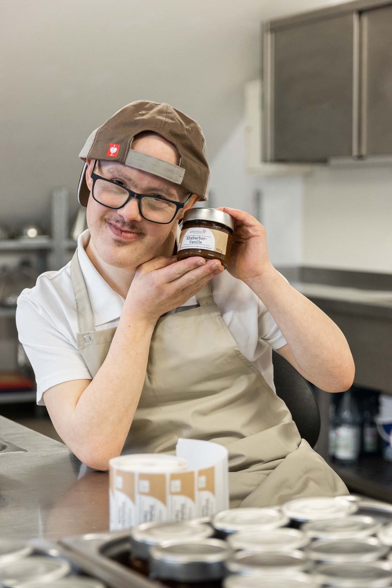 Wie genau muss man eigentlich das Etikett aufs Glas aufbringen? Wo ist der Weg ins Lager? Ist das Glas ordentlich gereinigt oder muss da noch mal nachgearbeitet werden? Wenn ein neuer Mitarbeiter oder ein Praktikant eine Frage hat, dann wendet er sich am besten an unseren Dominik. Seit 2013 arbeitet der Freizeitmusiker und Wrestlingfan in unserer Feinveredlung, kennt fast alle der Arbeitsabläufe aus dem Effeff und liebt es, Neulingen unter die Arme zu greifen. Dominik hat seinen Weg von der Fuldaer Pestalozzischule, eine Förderschule mit dem Schwerpunkt geistige Entwicklung, über die Startbahn, die Arbeitsschule von antonius, in die Feinveredlung gefunden. Zu Beginn musste er sich daran gewöhnen, pünktlich zu sein und seine Pause nicht zu lange auszudehnen, aber beides klappt mittlerweile ausgezeichnet. Und einen Tipp aus unserem Sortiment hat er auch parat: Der Fruchtaufstrich Rhabarber-Vanille ist sein Favorit, weil der zugleich sauer, aber auch süß schmeckt.