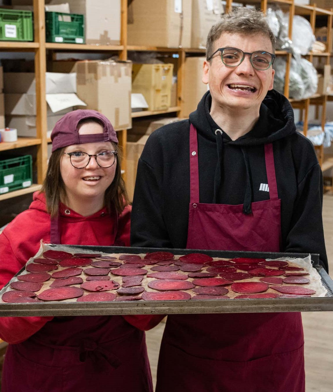 Haben seine Kolleginnen und Kollegen die Äpfel und Rote Bete dann in Scheiben geschnitten, legt Johannes diese auf ein Blech. Dann noch trocknen lassen und fertig sind leckere Apfel- und Rote-Bete-Chips. Johannes war Schüler in der Pestalozzischule, einer Förderschule mit Schwerpunkt geistige Entwicklung in Fulda. Danach besuchte er die Startbahn, die Arbeitsschule von antonius, wo er für seine Ausbildung in der Gemüseverarbeitung vorbereitet wurde. 2011 hat er diese abgeschlossen und schon da war ihm klar: Hier möchte er auch weiterhin arbeiten. Übrigens: Da Johannes so viel mit Obst arbeitet, ist es nicht verwunderlich, dass auch das Lieblingsessen des passionierten Urlaubers nicht ohne eine fruchtige Note auskommt. Am liebsten hat er nämlich eine Pizza Hawaii auf dem Teller.