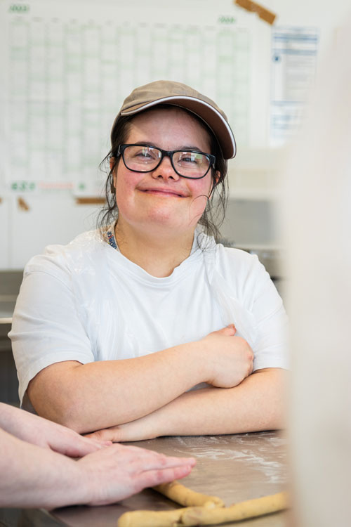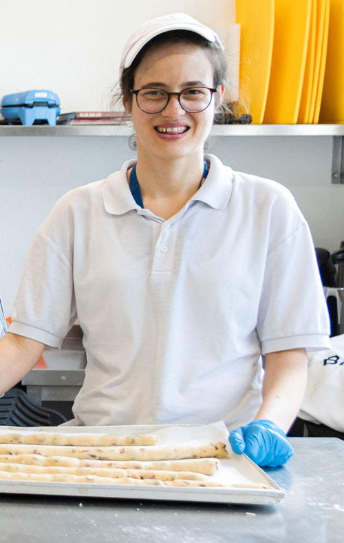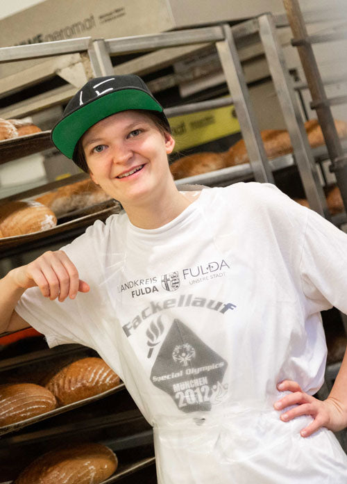 Auch abseits dieser Feste bringt Lisa viel Herzenswärme und gute Laune in die Backstube, erzählt liebend gern Witze und verschenkt auch mal eine Umarmung. Mehrere Bäckereien hat sie während verschiedener Praktika über die Arbeitsschule Startbahn kennengelernt, doch in der antonius Bäckerei hat es ihr am besten gefallen. Hier hat sie feste Aufgaben – zum Beispiel Pizza belegen – und packt überall mit an, wo Hilfe gebraucht wird. Nur die scharfen Messer machen Lisa Sorgen. Aber dann lässt sie sich einfach selber helfen. Geben und nehmen, dass funktioniert in der antonius Bäckerei besonders gut. Wir nehmen uns jetzt erstmal ein Schokobrötchen, Lisas Lieblingsprodukt von antonius.